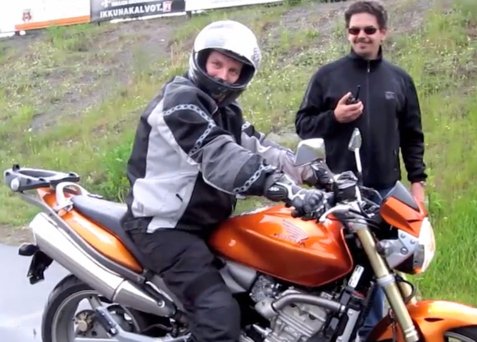 Tässä vaiheessa ajattelin luonnollisesti, että nyt minua ajelutetaan pyörän kyydissä ympäri kaupunkia ja sitten päädyn tekemään jotain muuta. Enhän ollut koskaan moottoripyörää ajanut ja kaverien mopoillakin vaan pieniä lenkkejä. Hyppäsin siis työkaverin kyytiin, ja lopuksi kymmenen kilometrin ajelun jälkeen saavuimmekin Ahveniston moottoridalle. Se oli yllättävää, koska rata sijaitsee melko lähellä paikkaa, josta lähdimme liikkeelle. Ahvenistolla meitä odotti innokas polttariporukka, pari moottoripyörää sekä ajo-opettaja. Oho, olin tainnut mainita moottoripyörähaaveesta myös muutamalle kaverilleni.